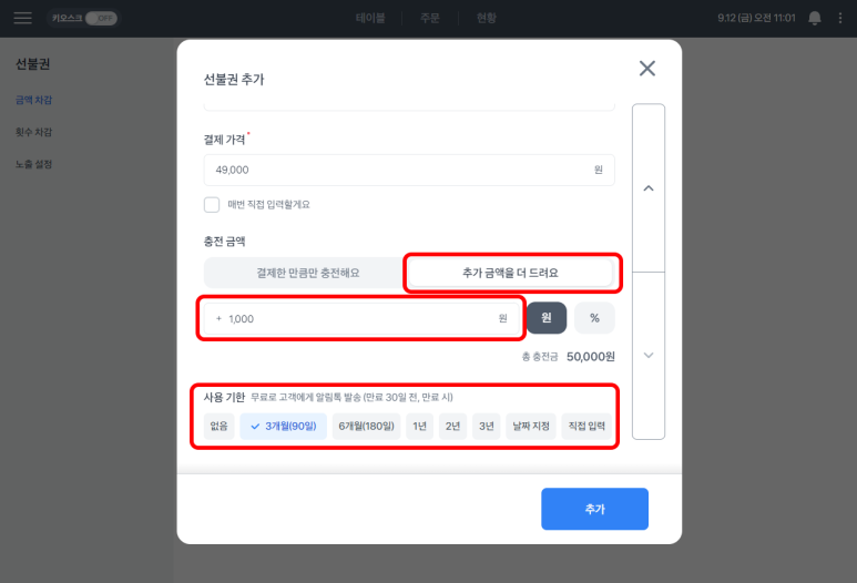 2. '선불권'의 이름 및 가격등 정보 입력